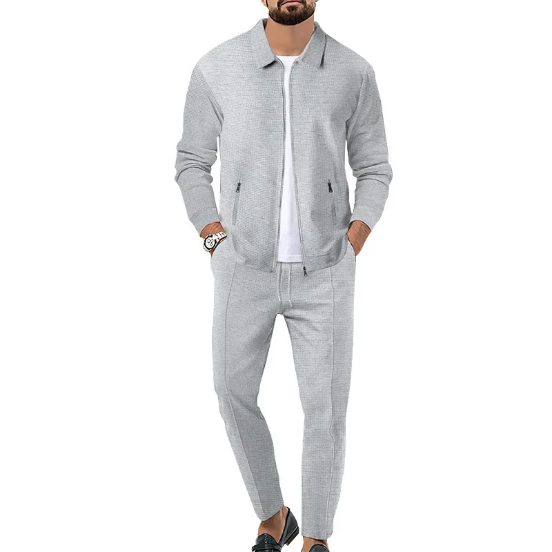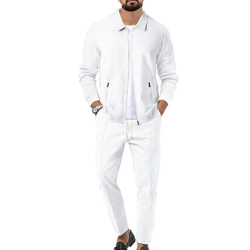 Men Two Piece Sets Pant Set Turn Down Collar Full Sleeve Solid Zipper Open Stitch Coats Long Pants Elastic Waist Lace Up Autumn